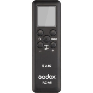 Control remoto Godox RC-A6 para luces LED Godox. Características: Frecuencia inalámbrica: 2.4 GHz. 32 canales, 6 grupos. Rango de 50 metros. Utiliza 2 baterías AAA (no incluidas). Tabla de Compatibilidad: SL150II. SL200II. SL150IIBi. FV150. FV200. LF308Bi. LF308D. S60. S30. LF308. Y más…