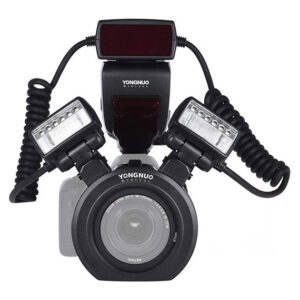 Twin Flash Macro Anular Yongnuo YN14EX, con funcionalidad E-TTL para cámaras Canon. Su diseño de doble flash montados a cada lado del lente provee excelente control sobre la posición de la luz. Compatible directamente con lentes de 52mm, 58mm, 67mm, 72mm. Características: Potencia con una sola cabeza: GN26 (m) a ISO 100….