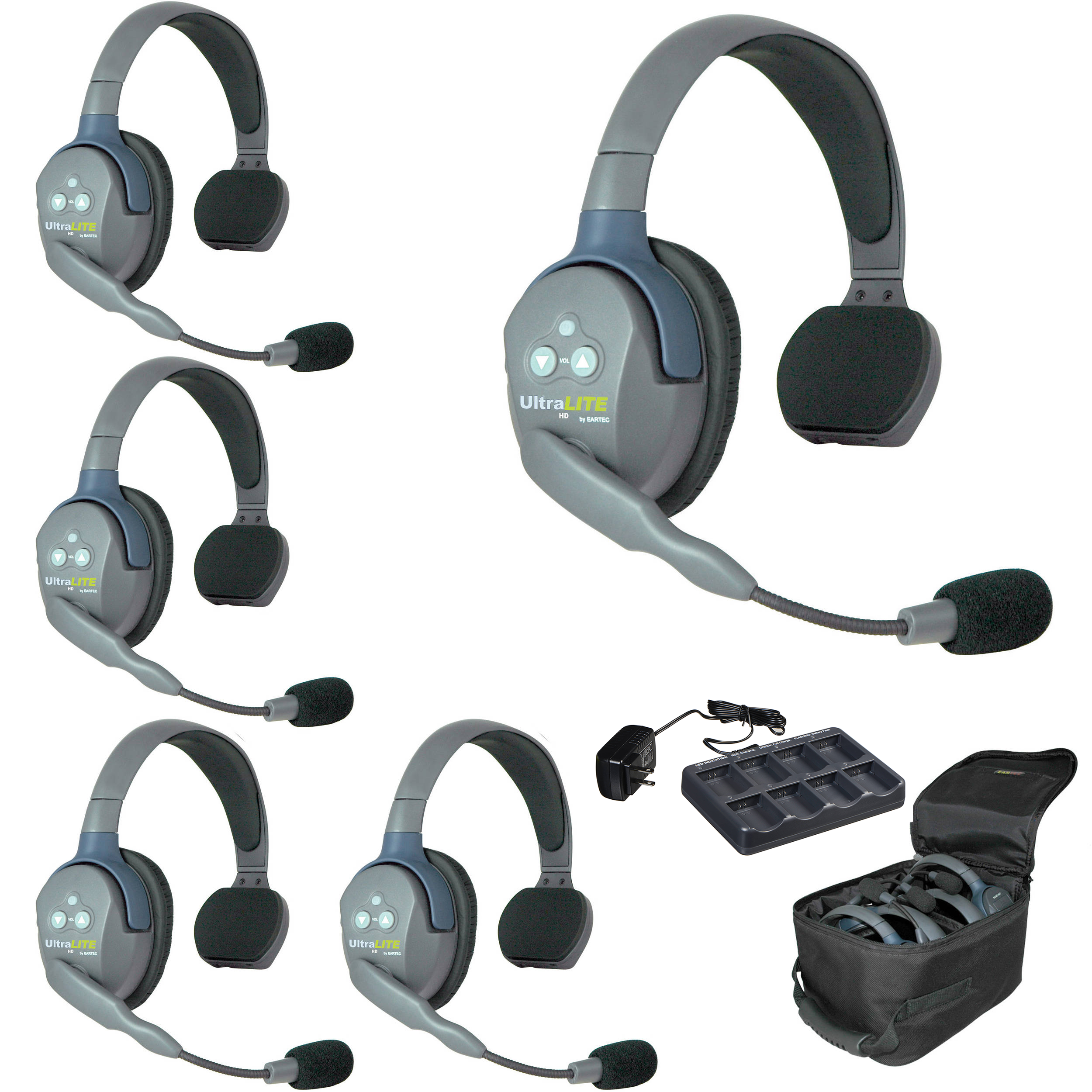 Kit de 5 intercomunicadores de diadema full-duplex Eartec UltraLITE de un solo oído, con baterías recargables de litio.