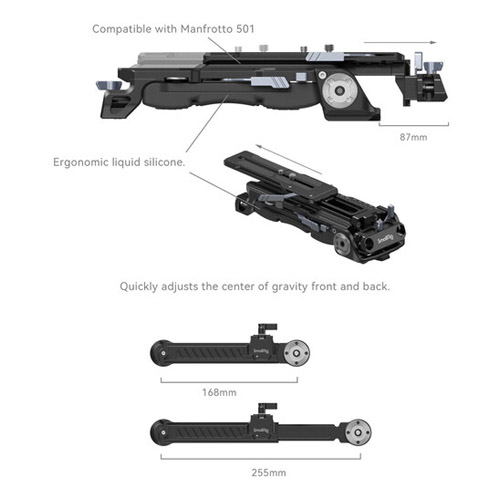 La placa Manfrotto 501 incluida cuenta con marcas de medición y se desliza hacia adelante y atrás dentro de un rango de 3,1″ para equilibrar la cámara en su hombro o plataforma. La abrazadera frontal de varilla de 15 mm se puede ajustar verticalmente 1,1″ para garantizar la altura adecuada de la varilla de 15 mm para determinadas cámaras de cine. La placa Manfrotto cuenta con tornillos de montaje de cámara de 1/4″-20 y 3/8″-16 y una llave plana que se guarda debajo de la placa base asegura los tornillos de la cámara.