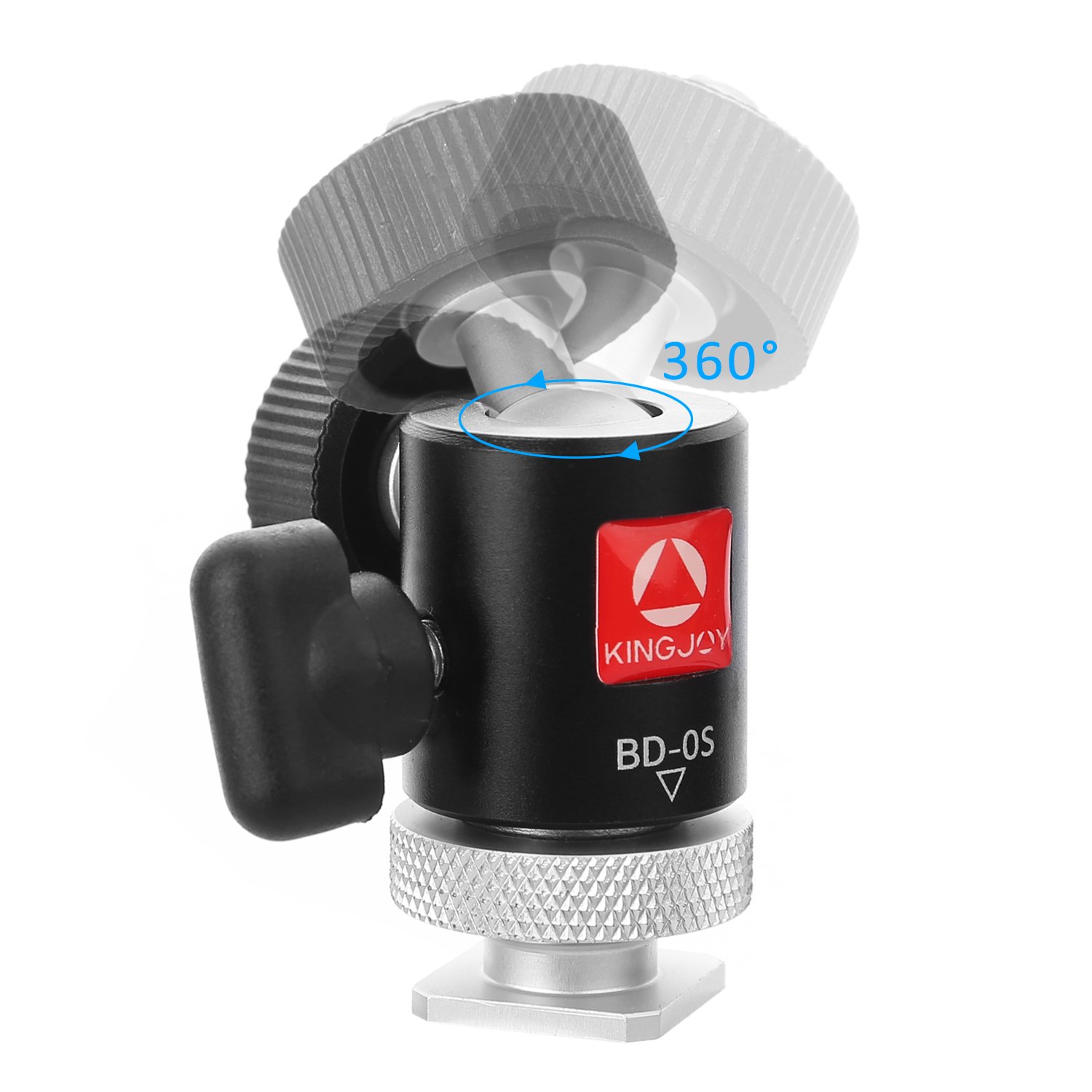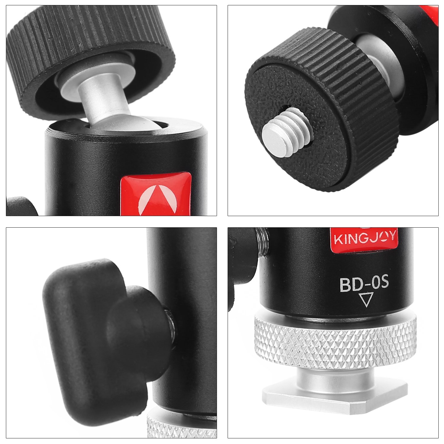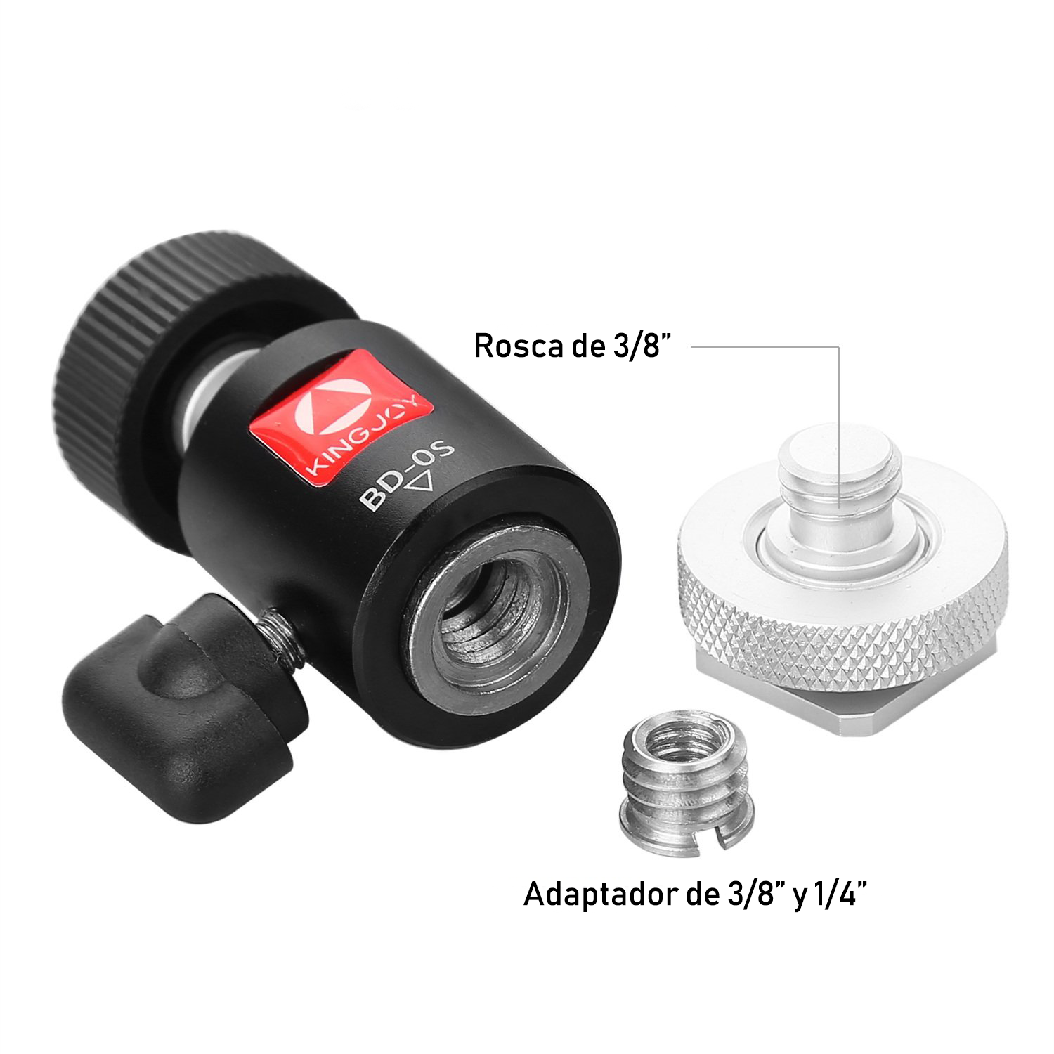Cabeza de bola Kingjoy BD-0S, con acople inferior de zapata, o 3/8” o 1/4″, y acople superior de 3/8” o 1/4″.