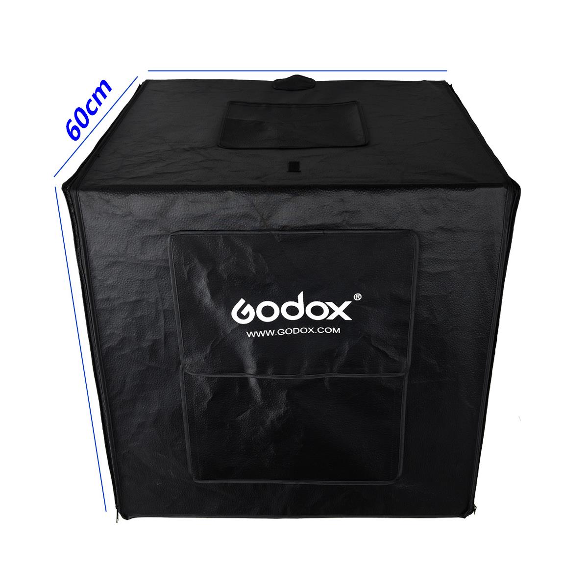 Mini estudio fotográfico, caja de luz, Godox LSD60, de 60 x 60 x 60 cm, con luces LED de 40 watts regulables en potencia incorporadas, paredes internas reflectivas, y PVC sinfín en colores blanco y negro.